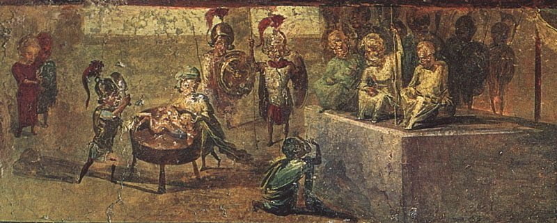 ”Jottei näyttäisi siltä, että hän oli tullut kaupunkiin valloittajana, hän ystävien neuvosta puki ylleen purppurareunuksisen toogan, ja sotajoukko pantiin järjestykseen. – – Kotkamerkkien edellä kulkivat valkoisiin puettuna sotilasleirien prefektit ja tribuunit sekä vanhimmat kenturiot, ja muut kenturiot kulkivat kukin oman joukko-osastonsa vieressä aseiden ja kunniamerkkien kimaltaessa.”
