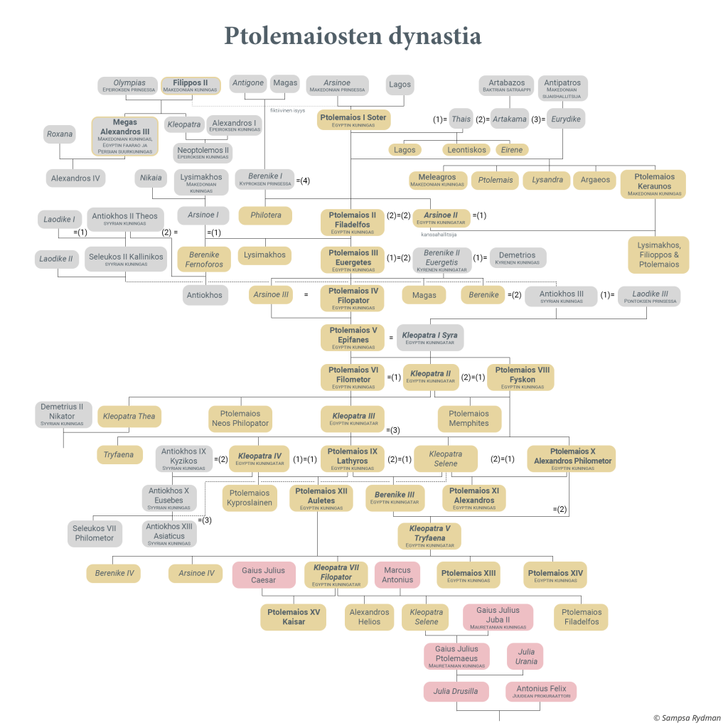 Egyptin kuningatar Kleopatra VII oli makedonialaisen Ptolemaiosten hallitsijasuvun viimeisiä edustajia. Hänen sukupuunsa on, miten sen nyt sanoisi, hieman visto mutta varmasti puhdasverinen – hän oli näet tulos insestistä sisarusten kesken kuudennessa sukupolvessa. Makedonialaisen verenperinnön lisäksi Kleopatran esivanhemmissa on mukana hippunen Syyriaa. Sukupuu ei ole aivan sataprosenttisen varma, koska dynastiassa oli tapana nimetä melkein kaikki miehet Ptolemaioksiksi eikä identifioimisensa ole täysin yksiselitteistä (järjestysnumerot ovat moderni keksintö). Kleopatraa esittäviä rahoja, kameekoruja, veistoksia ja patsaita on säilynyt useita.