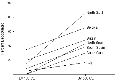 Jopa valtakunnan sydänmailla Italiassa väestö väheni. Vuonna 395 kirjattiin, että yli puoli miljoonaa auranalaa (132 000 hehtaaria) hedelmällistä Campanian maaseutua oli autioitunut ja mahdotonta verottaa. Milanon piispa Ambrosius kirjoitti samoihin aikoihin, että Bologna, Modena, Reggio ja muut kaupungit Aemilian alueella olivat puoliksi raunioituneita ja hylättyjä. Sata vuotta myöhemmin paavi Gelasius (492–496) väitti Toskanaa ja Aemiliaa ”lähes asumattomiksi”. Vaikka näissä väitteissä on varmasti liioittelua, väkimäärä näyttää laskeneen rajusti huippukaudesta 100-luvulla, jolloin Italiassa arvioidaan asuneen 12–13 miljoonaa ihmistä (Walter Scheidel: Demography, 2007). 400-luvulla Italiassa arvioidaan asuneen enää noin kuusi miljoonaa asukasta. Justinianuksen rutto ja sodat hävittivät Italian niin pahasti, että 500-luvulla asukkaita oli enää pari miljoonaa. Antiikin ajan väkiluku ylitettiin Italiassa vasta 1700-luvulla.