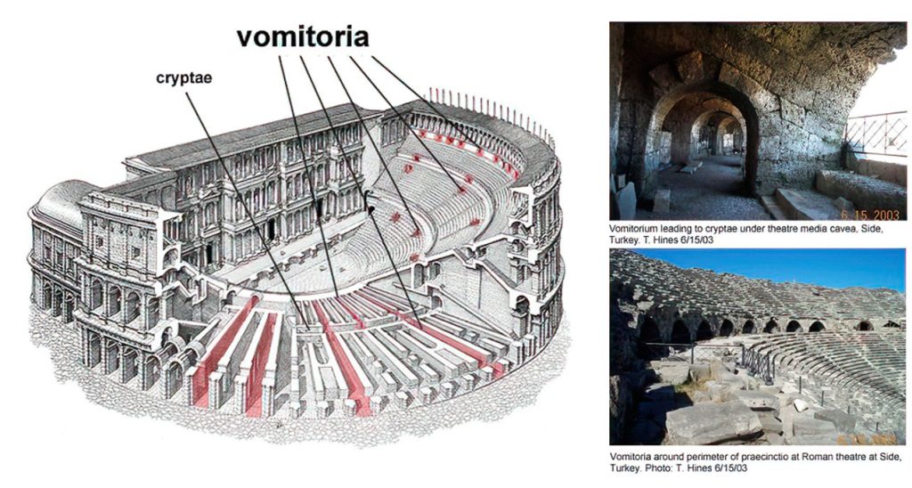 Useimpien orgiatarinoiden alkuperä on roomalaisen kirjailijan Petronius Arbiterin veijariromaanissa Satyricon, joka satiirina kertoo omasta ajastaan yhtä vähän kuin Manillaköysi Jatkosodasta. Vomitorium on kuitenkin täydellinen väärinkäsitys. Oikea vomitorium on stadioneilla tai teatterissa oleva katettu kulkuväylä, jonka kautta suuret katsojamäärät voivat poistua nopeasti esityksen jälkeen. Itse termi esiintyy ensimmäisen kerran vasta myöhäisantiikissa, jolloin eräs Macrobius Ambrosius Theodosius – paremmin tunnettu ”Scipion unen” kommentaarien kirjoittajana – käyttää sitä vitsikkäänä luonnehdintana kirjassaan (Saturnalia 6.4.3.).